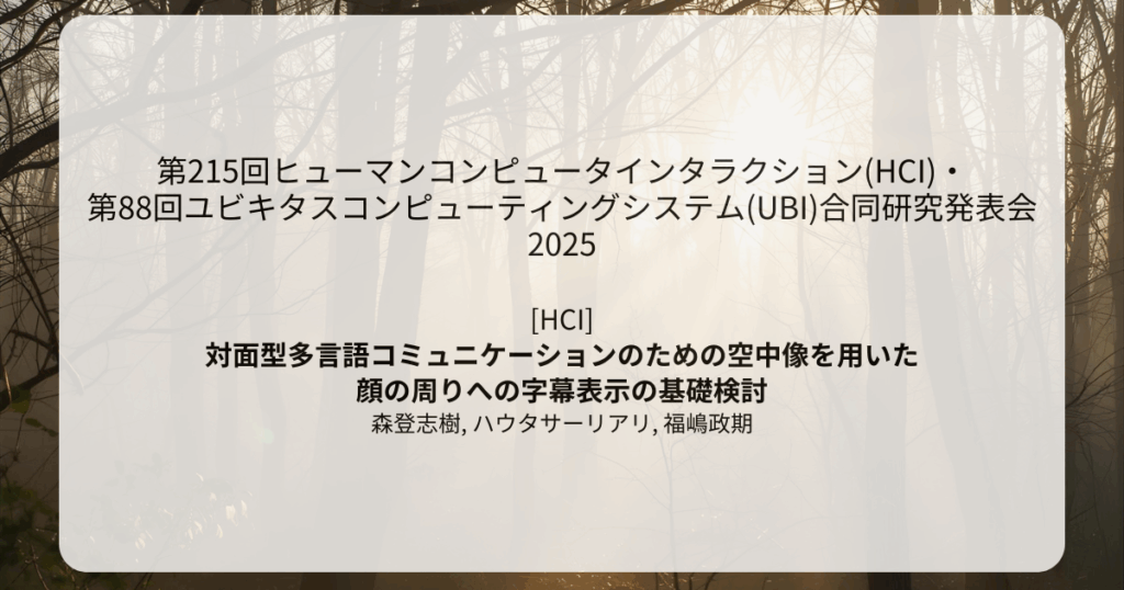 2025年11月26日〜11月27日に兵庫で開催される「第215回ヒューマンコンピュータインタラクション(HCI)・第88回ユビキタスコンピューティング(UBI)合同研究発表会」にて,論文1件の発表を行いました.
