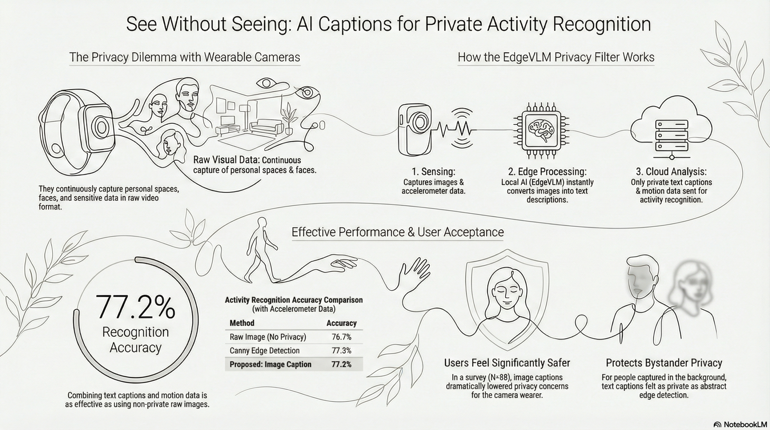 この論文は、ウェアラブルカメラを用いた人間活動認識(HAR)における、プライバシー保護と認識精度のトレードオフを解決するための新しいアプローチを提案しています。従来のカメラベースの手法では、生活環境の豊かなコンテキストを取得できる反面、顔や機密情報が記録されるリスクがあり、一方で過度な匿名化(ぼかし処理など)は認識に必要な特徴を損なうという課題がありました。